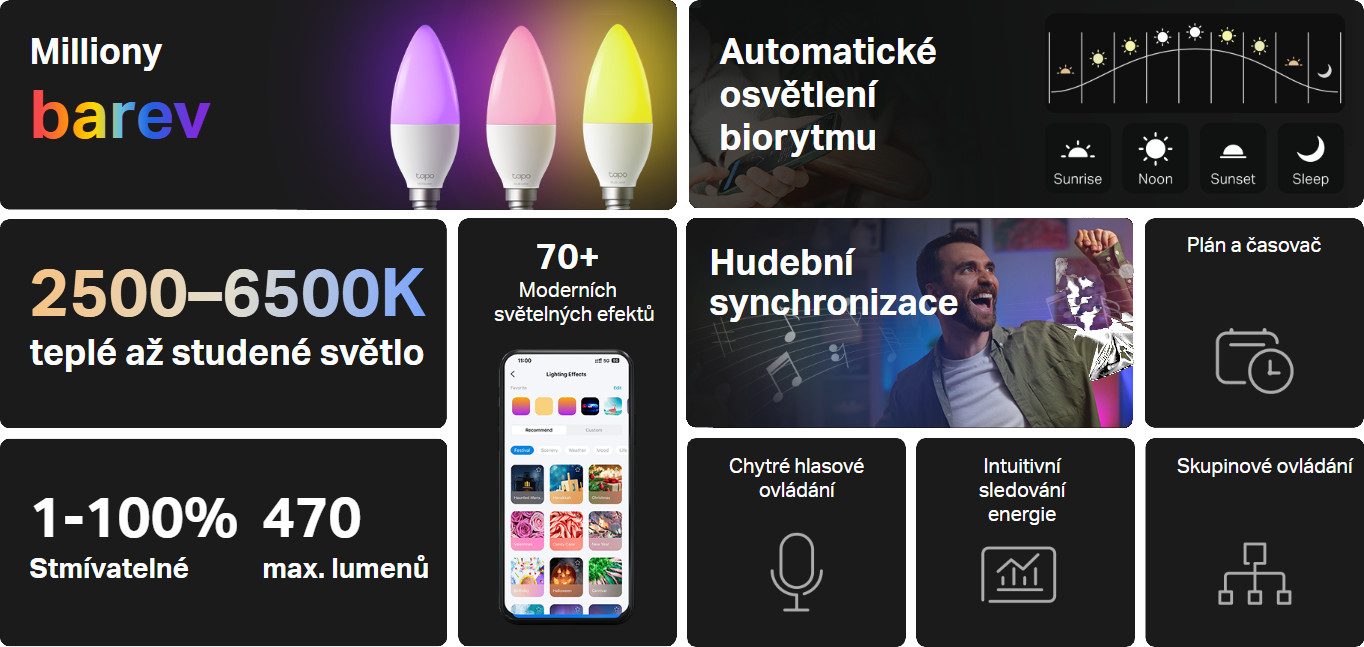 Ovládejte svou chytrou žárovku odkudkoli pomocí aplikace Tapo. Stmívejte, zapínejte a vypínejte žárovky nebo měňte jejich barvy na dálku a na dosah ruky.