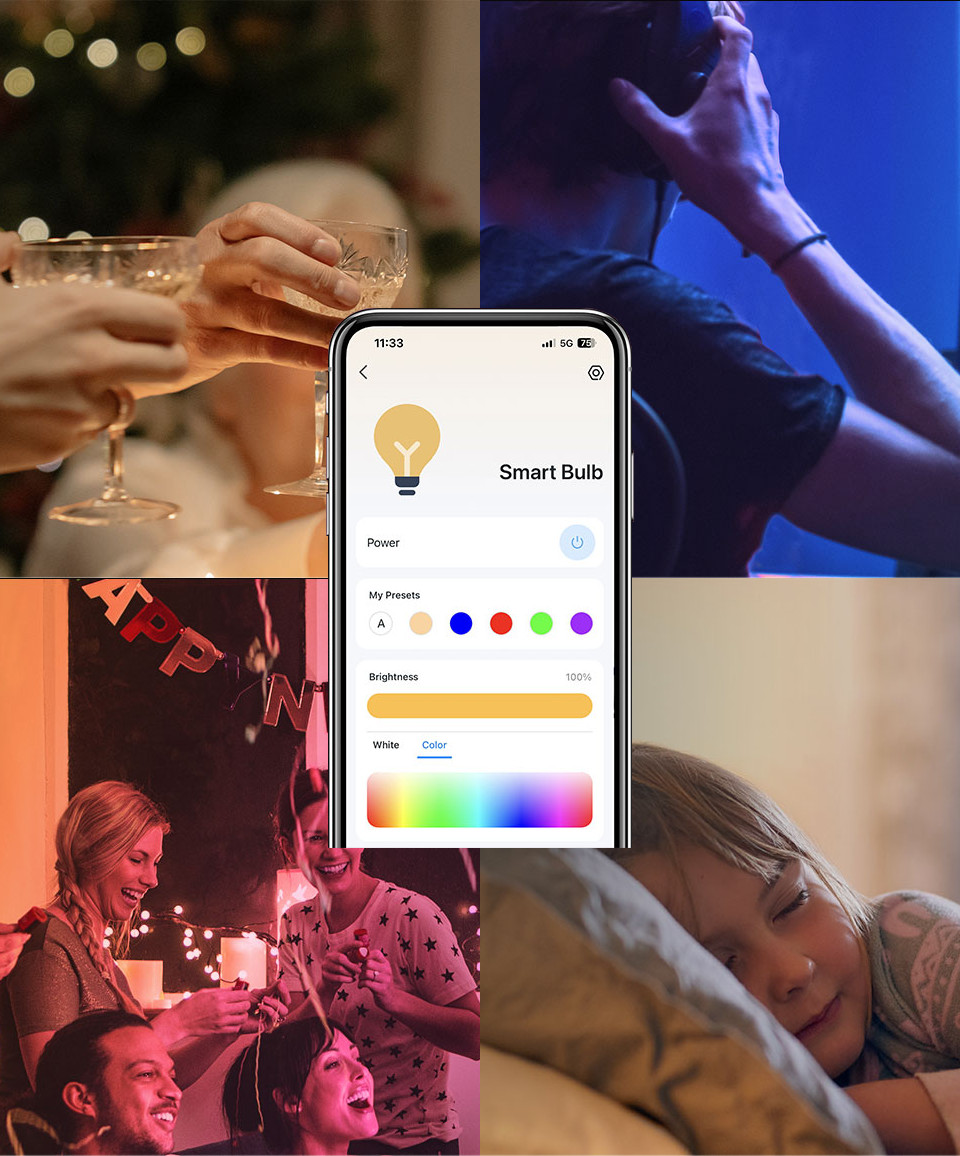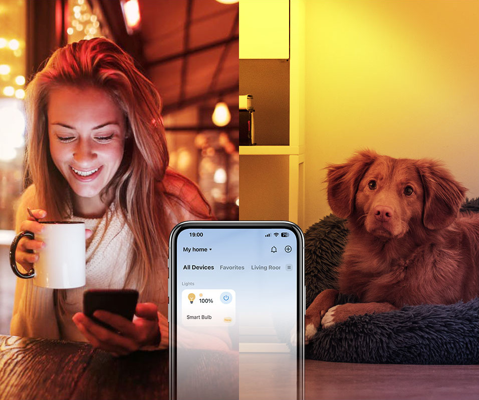 Ovládejte svou chytrou žárovku odkudkoli pomocí aplikace Tapo. Stmívejte, zapínejte a vypínejte nebo měňte barvy žárovky na dálku na dosah ruky.