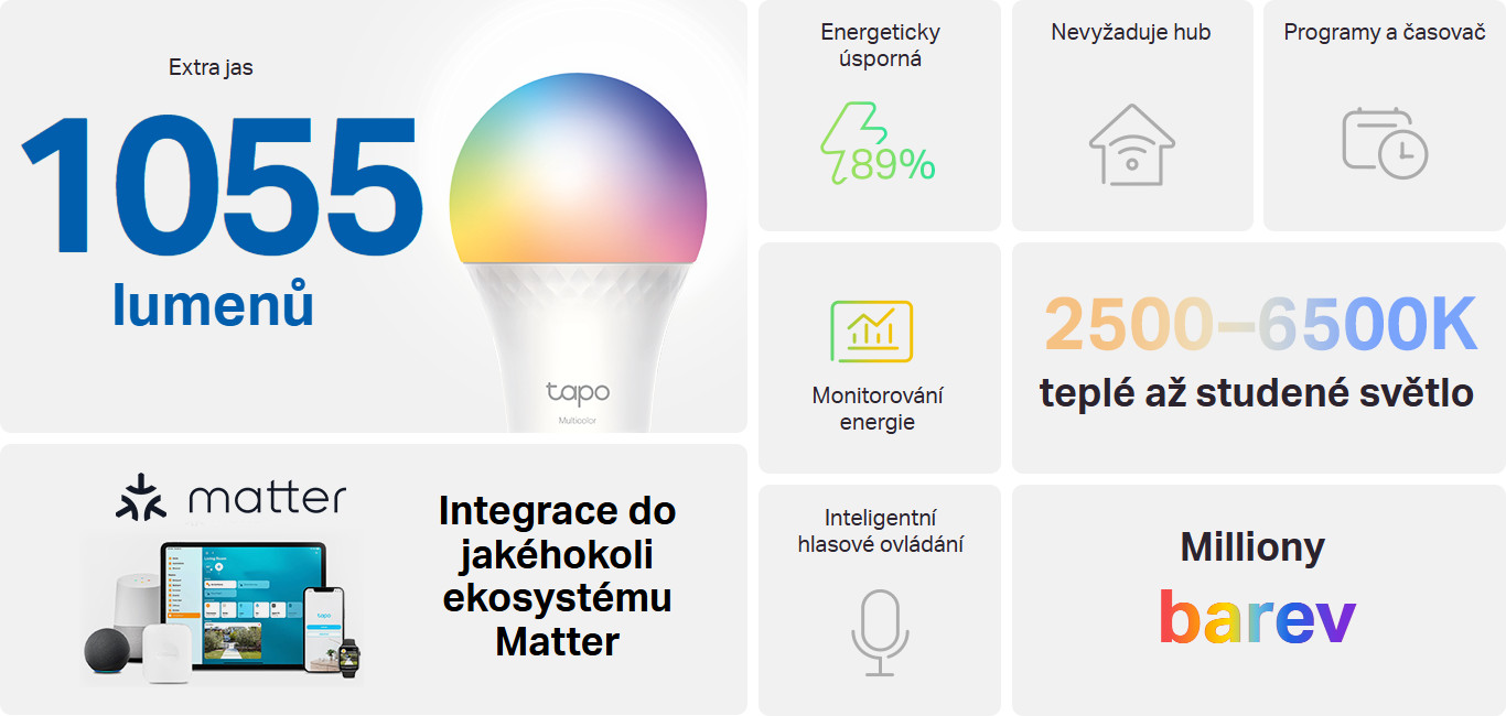 Tapo L535E poskytuje 1 055 lumenů ostrého, vysoce kvalitního osvětlení, což je více než většina standardních barevných inteligentních žárovek s 800 lumeny. Může rozjasnit vaši každodenní rutinu nebo činnosti a je ideální pro jakýkoli prostor ve vaší domácnosti, který vyžaduje jasnější osvětlení.
