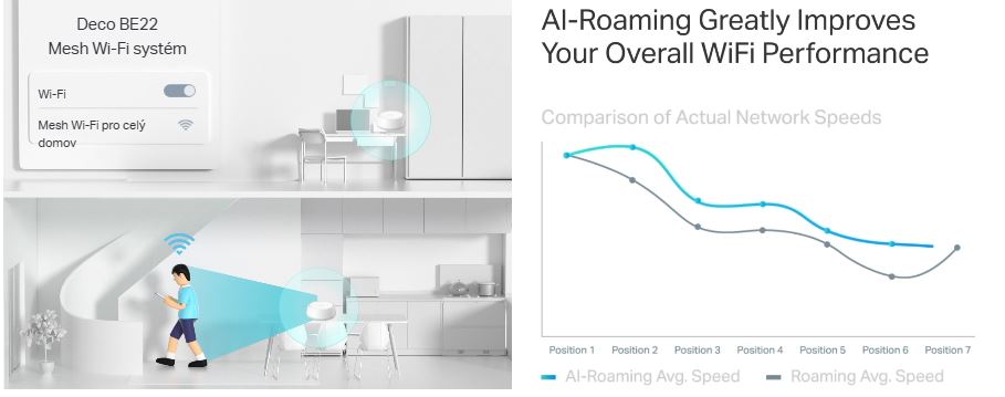 Deco Mesh vytváří jednotnou síť s jedním názvem. Díky AI-Roaming technologii se s vícenásobnými jednotkami učí a optimalizuje připojení. Procházejte domem a užívejte si plynulé streamování na maximální rychlosti.