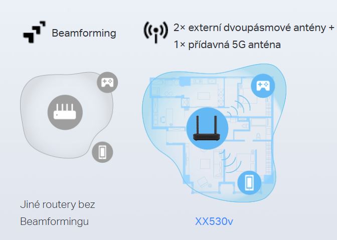 Vysoce výkonné dvoupásmové antény a technologie beamformingu spolupracují na optimalizaci pokrytí Wi-Fi, aby dokonale odpovídalo vaší domácnosti a soustředilo signál směrem k jednotlivým zařízením.