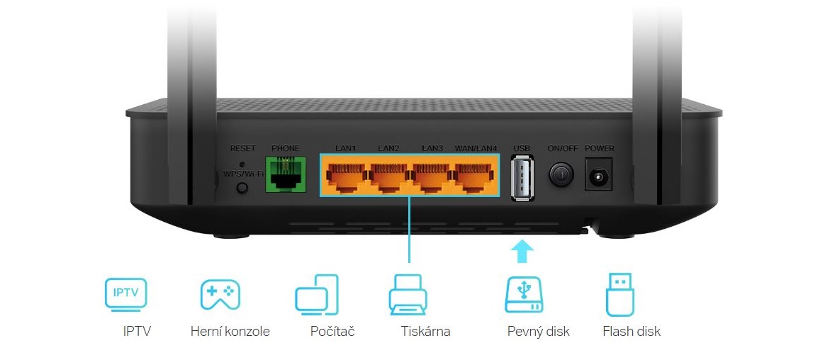 Gigabitové Ethernet porty umožňují plné využití rychlosti připojení až 1 Gb/s. Připojte počítače, chytré televize nebo herní konzole ke kterémukoli LAN portu (včetně WAN/LAN) pro stabilní kabelové připojení. Pomocí USB portu můžete v rámci domácí sítě sdílet soubory, hudbu i videa vysokou rychlostí.