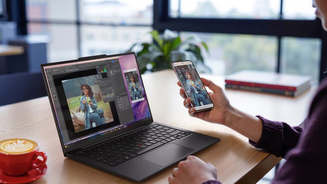 Funkce Smart Share okamžitě propojí váš chytrý telefon s notebookem prostřednictvím virtuálního snímače s umělou inteligencí. Stačí přiložit zařízení se systémem Android™ nebo iOS k notebooku - a pak přetáhnout. Upravujte fotografie a snadno je sdílejte. Navíc získejte přístup k textovým zprávám a posílejte je z počítače.
