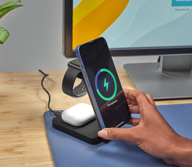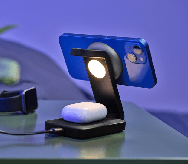 Tento nabíjecí stojan, speciálně navržený pro produkty Apple, perfektně funguje s iPhony 12 a novějšími, Apple Watch a Airpods. Stačí zařízení vložit do stojanu a všechny vaše nezbytné věci budou uspořádané a nabité.