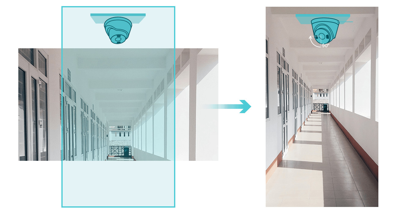 Otáčejte živý obraz a objektiv současně o 90° ve směru hodinových ručiček. Tím se změní poměr stran obrazu z 16:9 na 9:16, což vám pomůže monitorovat dlouhé a úzké oblasti a poskytuje přirozenější zážitek z prohlížení.