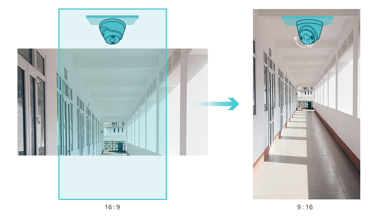Otočte si živé zobrazení a objektiv současně o 90° ve směru hodinových ručiček. Poměr stran obrazu se tak změní z 16 : 9 na 9 : 16, abyste mohli lépe a přirozeněji sledovat dlouhé a úzké oblasti (např. chodby).