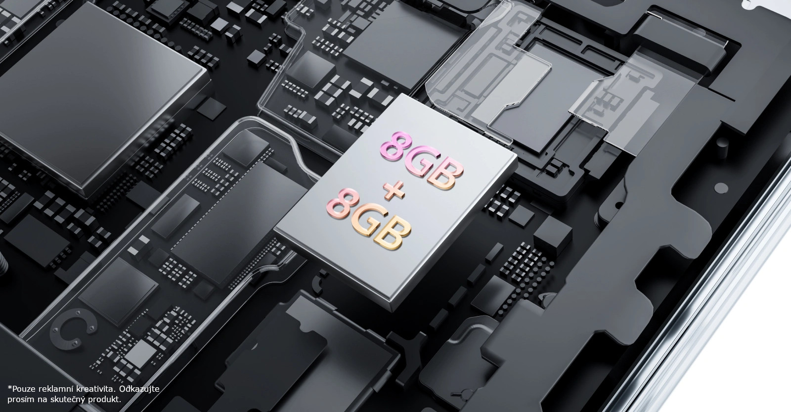 8 + 8 GB RAM zajišťuje plynulý multitasking a přepínání mezi aplikacemi, zatímco komprese úložiště maximalizuje prostor na všechny zásadní věci.
