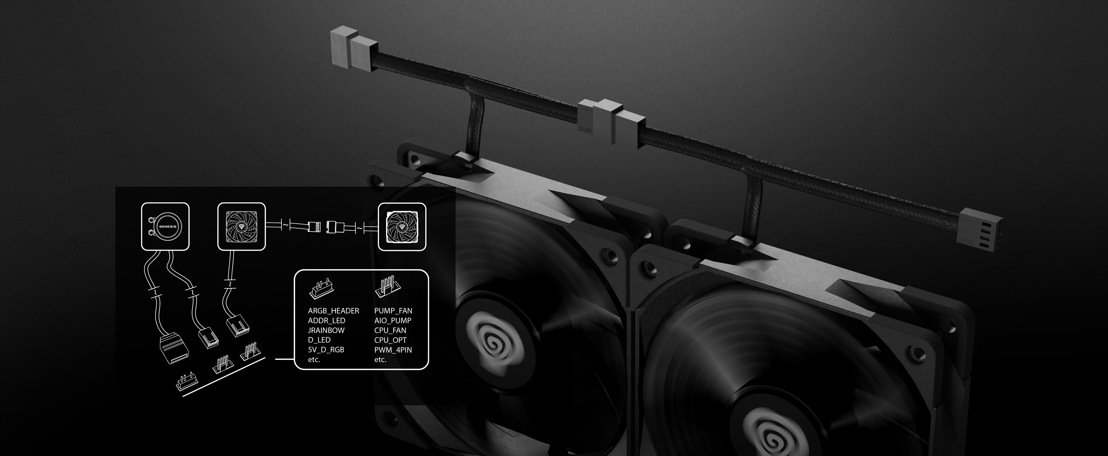 K provozu chlazení jsou zapotřebí pouze tři konektory - čerpadlo, ventilátory a - volitelně - ARGB, takže instalace je snadná, rychlá a bezproblémová.
