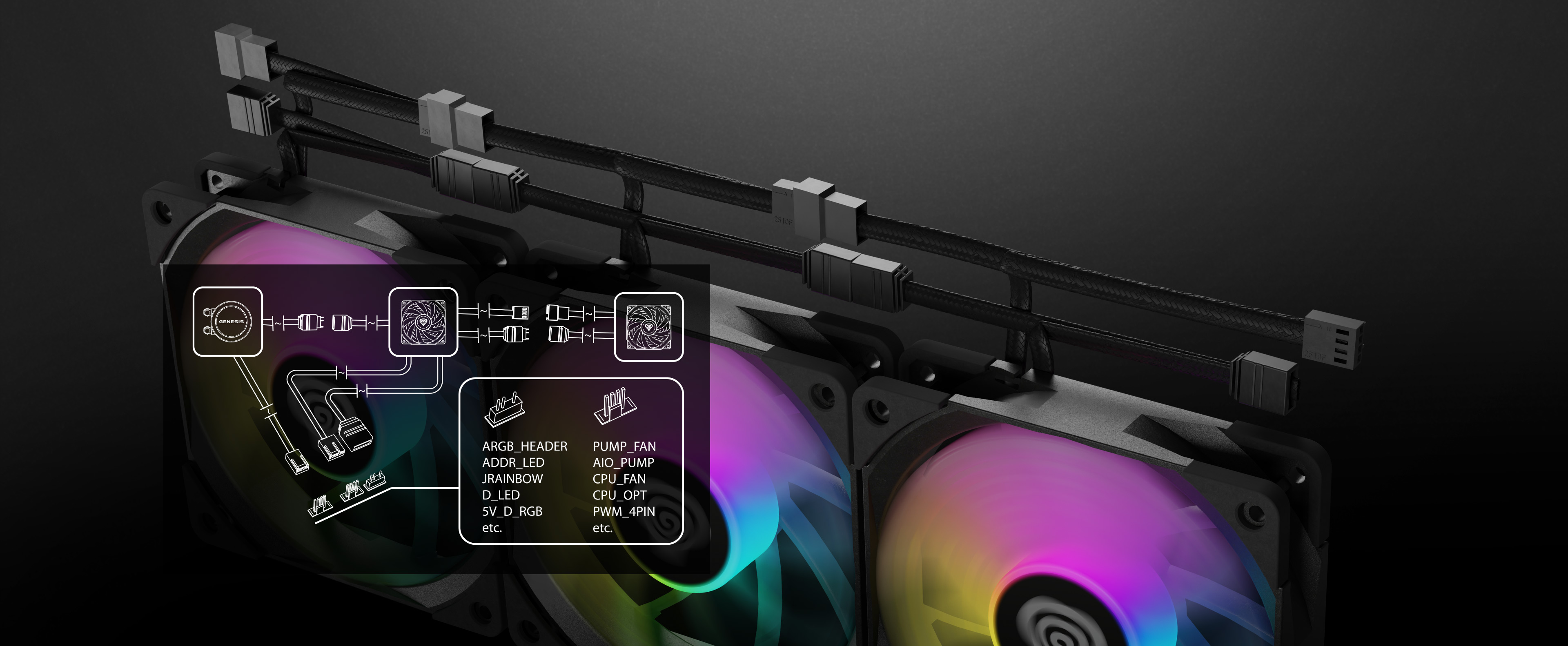 K provozu chlazení jsou zapotřebí pouze tři konektory - čerpadlo, ventilátory a - volitelně - ARGB, takže instalace je snadná, rychlá a bezproblémová.