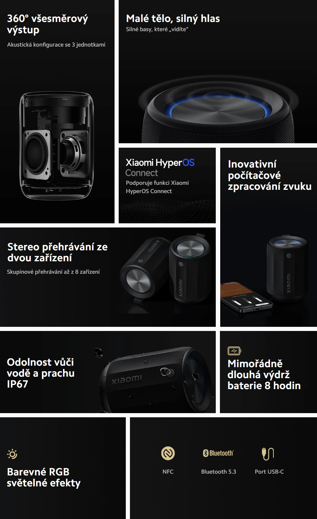 Řada Bluetooth reproduktorů Xiaomi stále prosazuje filozofii „autentického“ zvuku. Kombinace vlastní konstrukce se symetrickou architekturou a převratné technologie počítačového zpracování zvuku poskytuje harmonický a přirozený zážitek z poslechu hudby. Je navržen pro venkovní použití. Je přenosný, může se pochlubit silnou hlasitostí, mocnými basy a systémem Xiaomi HyperOS, což zaručuje vynikající kvalitu zvuku, ať se vydáte kamkoli. Pečlivě zpracovaný Bluetooth reproduktor Xiaomi pro všechny milovníky hudby a života.