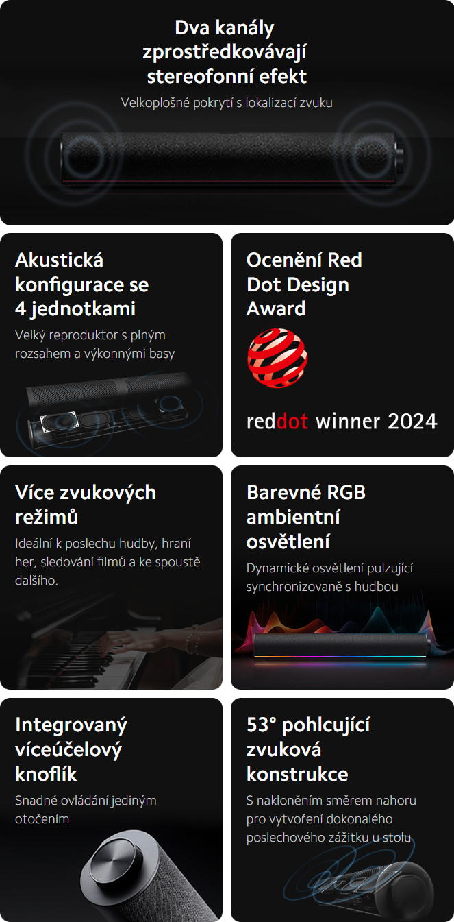 Dvoukanálové stereo, ocenění Red Dot Design Award, ambientní RGB osvětlení a více zvukových režimů