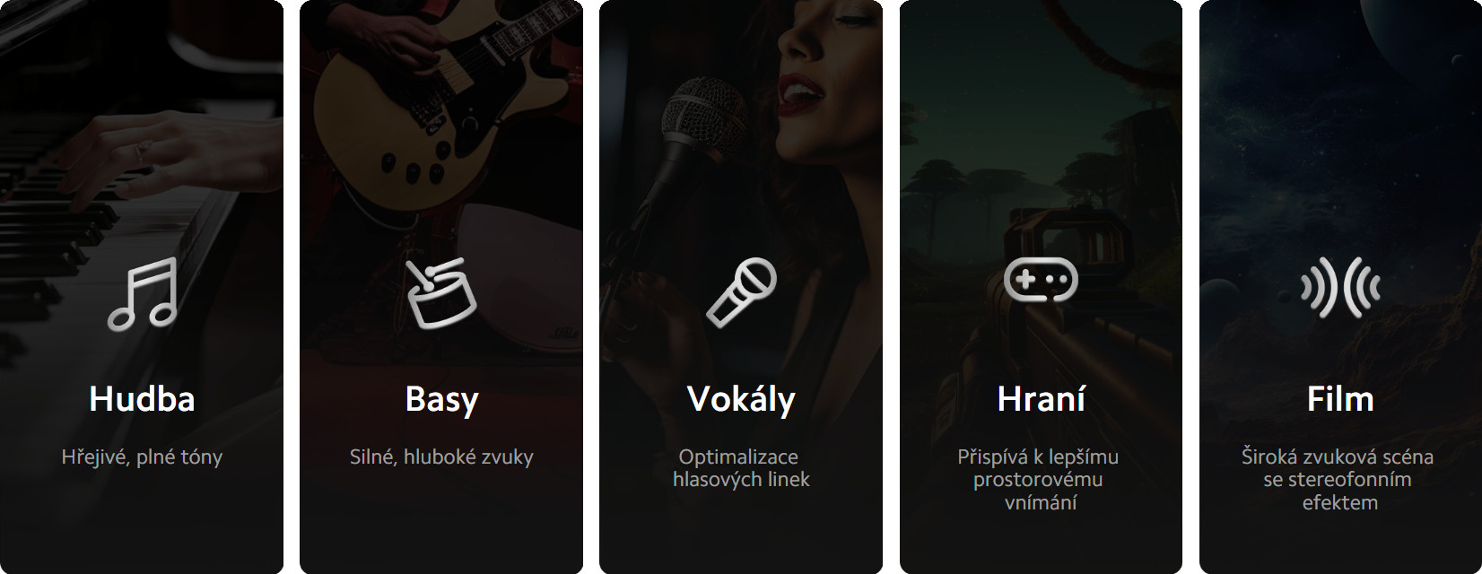 Symetrické duální uspořádání s vnitřními vzduchotěsnými komorami snižuje rušení kanálů na minimum, zatímco široká a vícevrstvá zvuková scéna dokáže zajistit stereofonní zvuk, který potěší vaše uši. Umožňuje rovněž přesnější identifikaci polohy zvuku během hraní her.