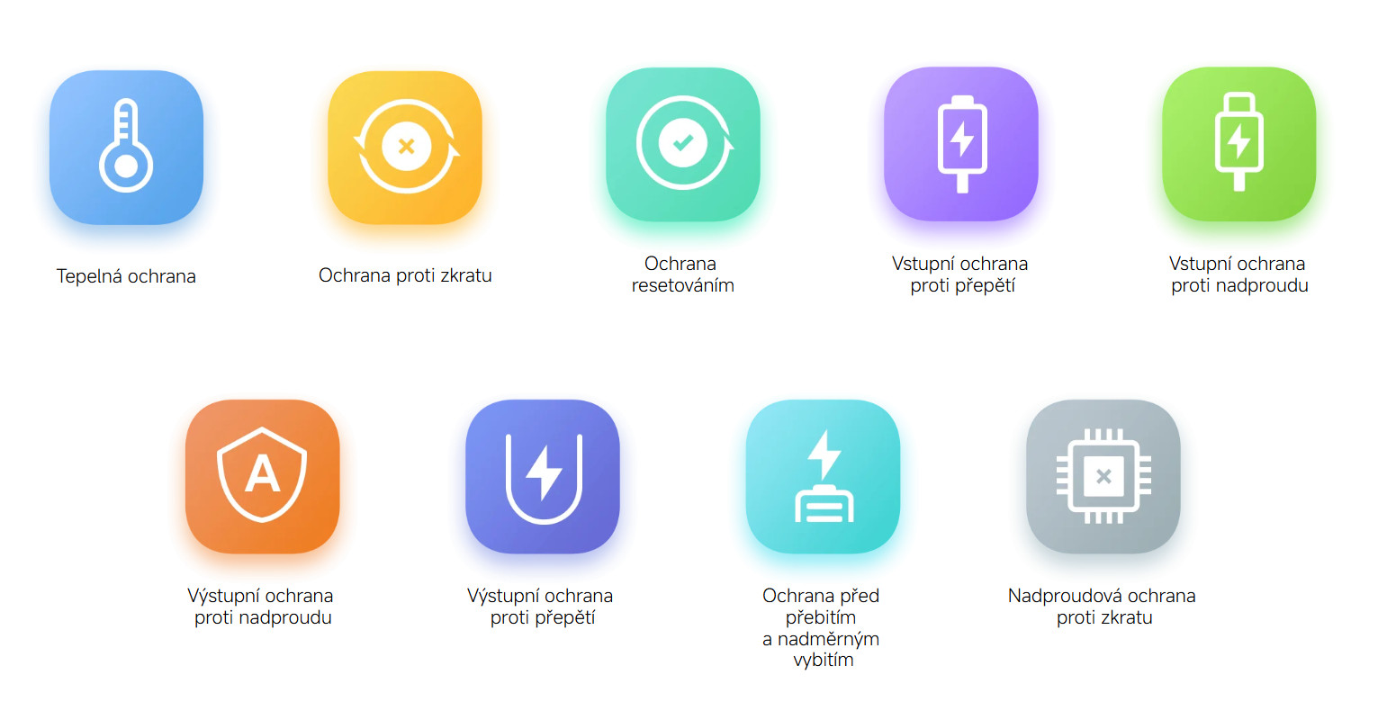 Vestavěný chytrý ovladač nabíjení prostřednictvím portu USB je navržen s několika vrstvami ochrany, které snadno zvládnou i komplikace, jako je přebíjení, nadměrné vybíjení a zkrat, a zajišťují tak spolehlivou ochranu vašich zařízení.