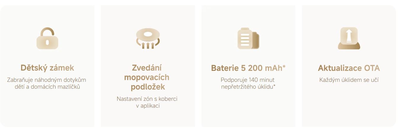 Chytrý zatahovací boční kartáč a automatické vysouvání mopovacích podložek zaručuje čištění prachu podél zdí a v rozích s milimetrovou přesností. Robotický vysavač má navíc samostatnou nádržku na vodu a přesnou regulaci množství vody, aby byla podlaha ve vaší domácnosti jako ze škatulky.