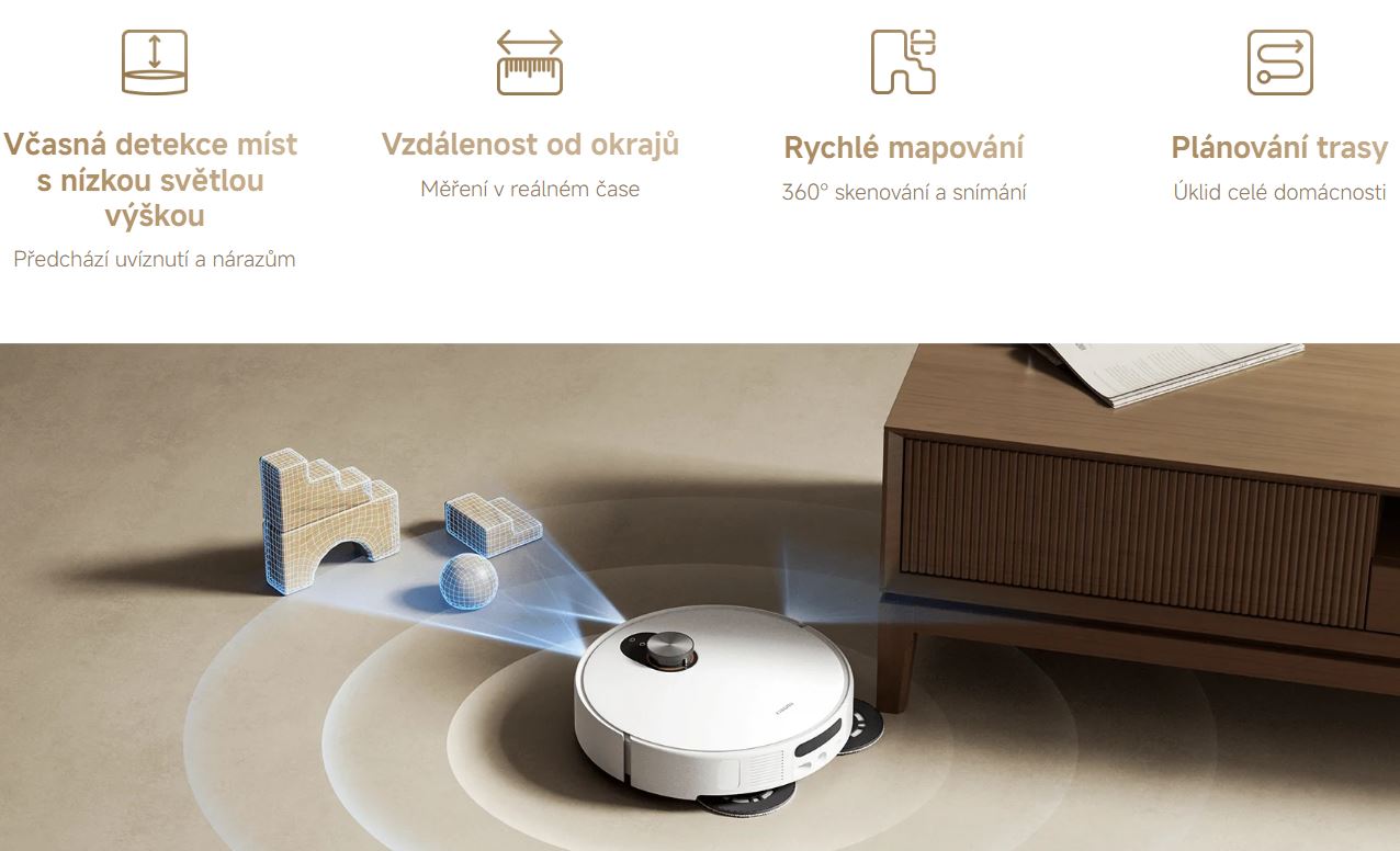 Modul je vybaven zcela novým zatahovacím laserovým navigačním systémem. Automaticky se sníží při detekci oblastí s nízkou světlou výškou a promění se na velmi úzkou hlavní jednotku, díky čemuž se robotický vysavač vejde do oblastí s výškou pouhých 9,5 cm. Výsledkem je ještě účinnější úklid. Minimální dostupná výška 9,5 cm: Robotický vysavač se dokáže díky radaru automaticky snížit a vyčistit prostory se světlou výškou 9,5 cm a více. Robotický vysavač do těchto oblastí nevjede během mapování. Standardní oblasti mají při úklidu prioritu před prostory s nízkou světlou výškou.