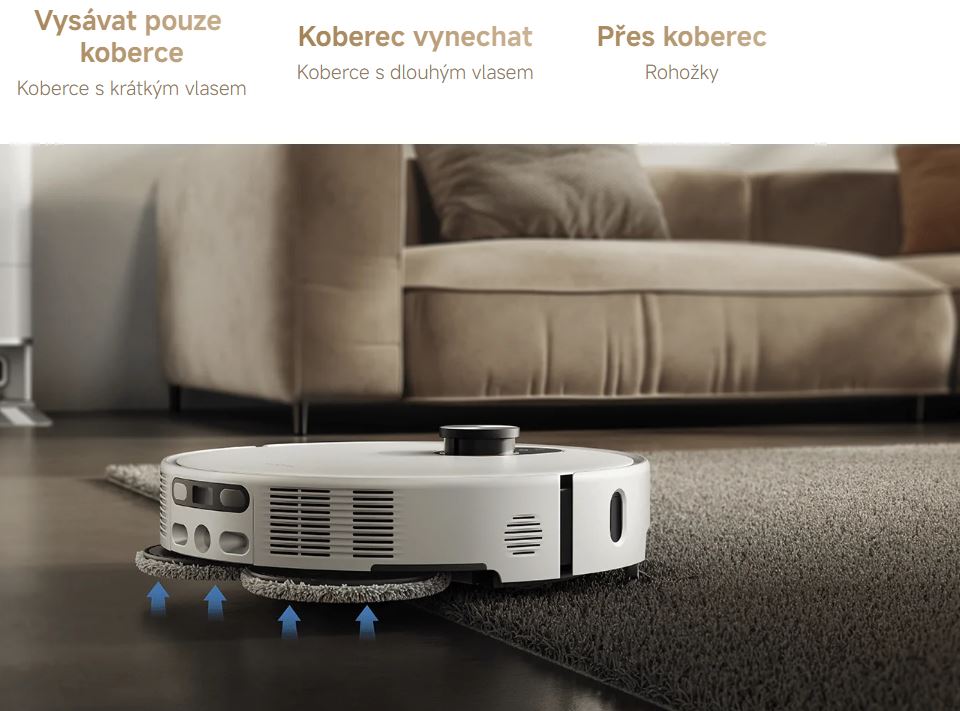 Pomocí ultrazvukového snímače podlahy automaticky detekuje koberce a zvedá mopovací podložky o 15 mm, aby nedošlo ke kontaktu. K dispozici je několik režimů čištění pro různé typy koberců, aby vaše koberce byly dokonale čisté a zároveň suché.