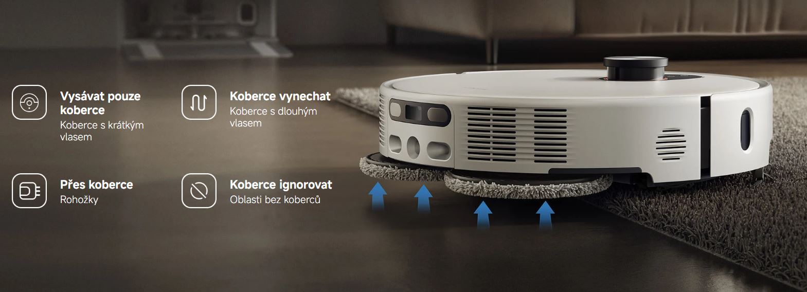 Pomocí ultrazvukového snímače podlahy automaticky detekuje koberce a zvedá mopovací podložky o 15 mm, aby nedošlo ke kontaktu. K dispozici je několik režimů čištění pro různé typy koberců, aby vaše koberce byly dokonale čisté a zároveň suché.