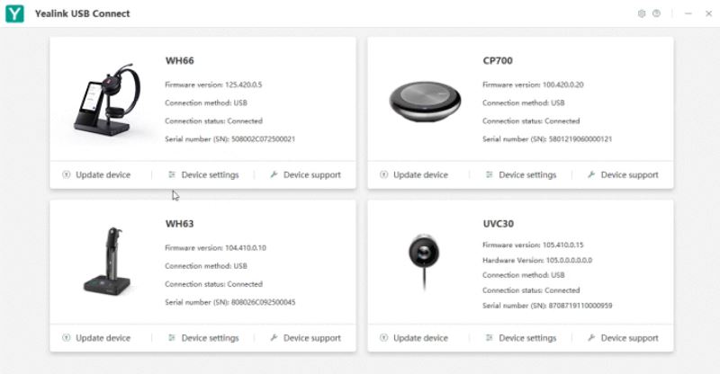 Yealink USB Connect je k dispozici pro správu více zařízení Yealink USB, včetně bezdrátových kancelářských sluchátek, hlasitých odposlechů a webových kamer. Všechna nastavení lze provést prostřednictvím Yealink USB Connect, například nastavení základních a prémiových funkcí WH66, což je pohodlné a efektivní pro každodenní použití.
